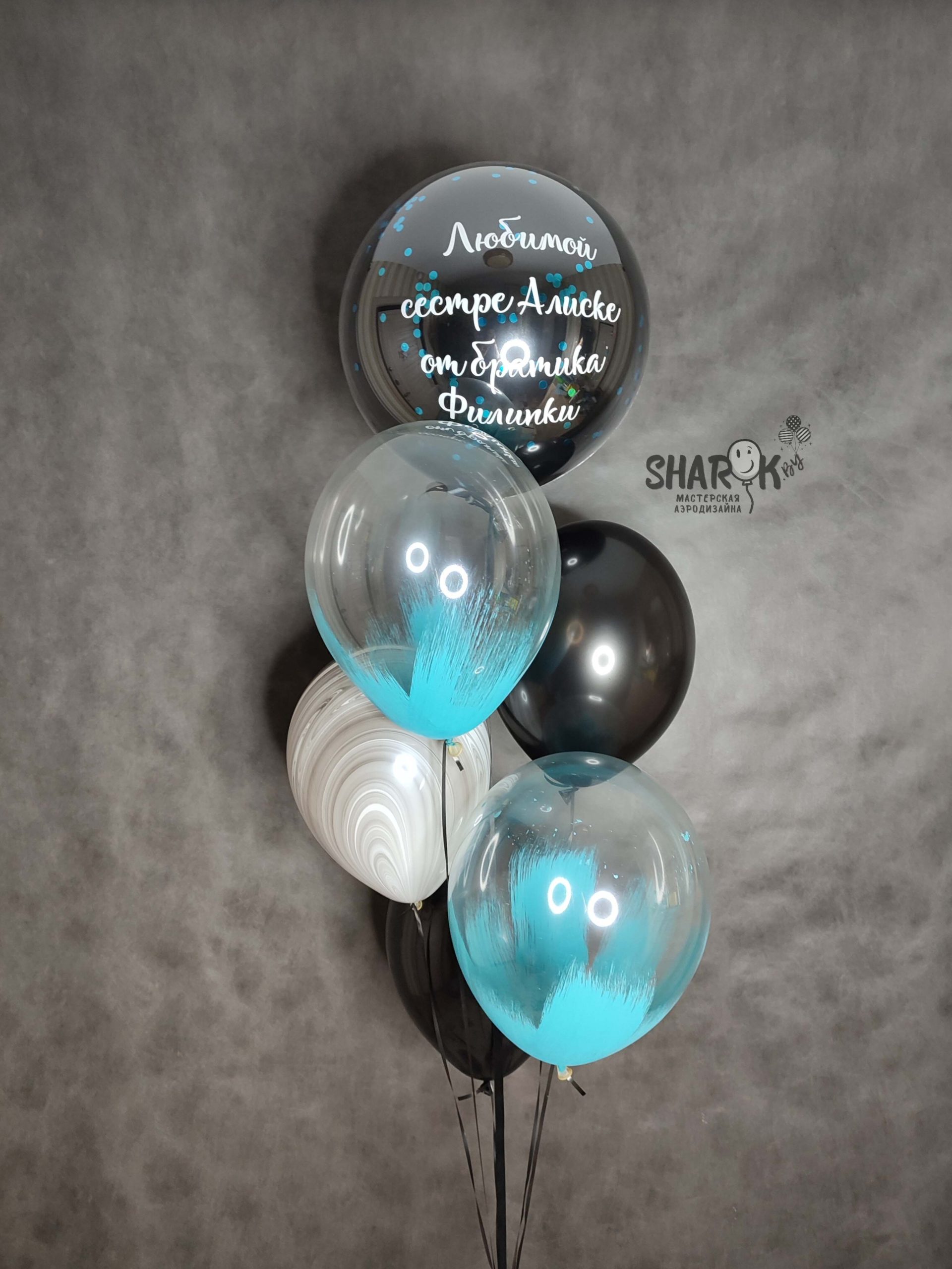 В сет входит стеклянный шар 18″ (45 см) с индивидуальной надписью, 2 шара браш, 1 шар агат, 2 однотонных шара.